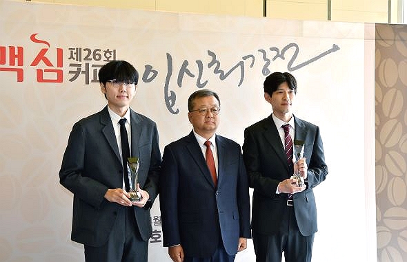 '제26기 맥심커피배 입신최강전'시상식 기념사진. (왼쪽부터) 준우승 신진서 9단, 김광수 동서식품 대표, 우승 이지현 9단 [한국기원]