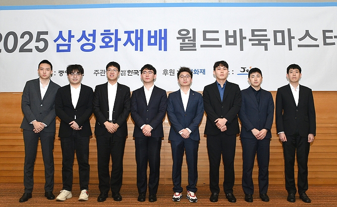 2025 삼성화재배 월드바둑마스터스 8강 진출자 단체 사진. (왼쪽부터) 푸젠헝 7단, 랴오위안허· 탄샤오· 딩하오·양딩신·박정환·김지석·강동윤 9단 [한국기원]