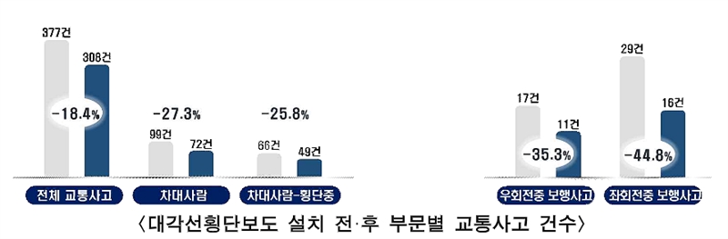 사고 중 '차 대 사람' 사고 건수는 27.3%(99→72건), '횡단 중 사고' 건수는 25.8%(66→49건) 줄어들었다.
