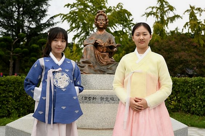 지난 4회 대회에서 우승한 김은지 9단(오른쪽)과 준우승 허서현 5단이 대회가 끝난 후 허난설헌 동상 앞에서 기념사진을 촬영했다. [한국기원]