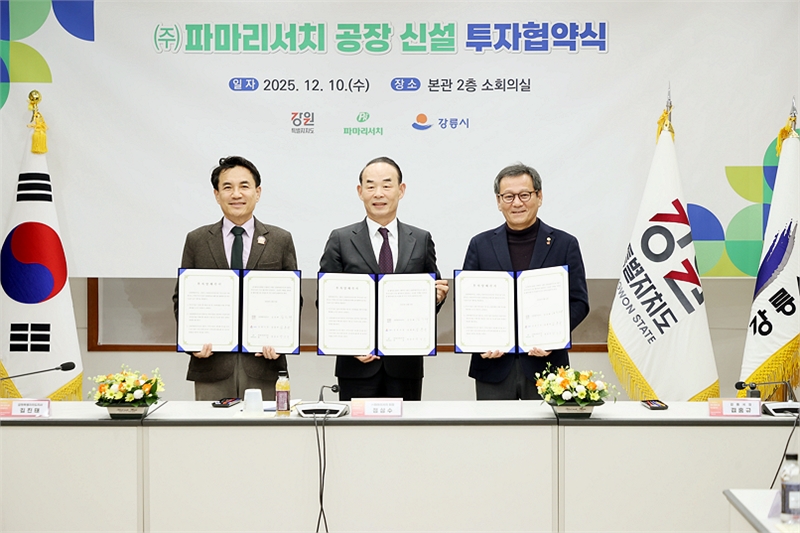 이날 협약식에는 김홍규 강릉시장을 비롯해 김진태 강원특별자치도지사, 정상수 파마리서치 회장 등이 참석했다.