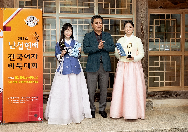 지난해 난설헌배 전국 여자바둑대회 3연패에 성공한 김은지 9단(오른쪽)과 김홍규 강릉시장(가운데), 준우승 허서현 5단 [강릉시청]