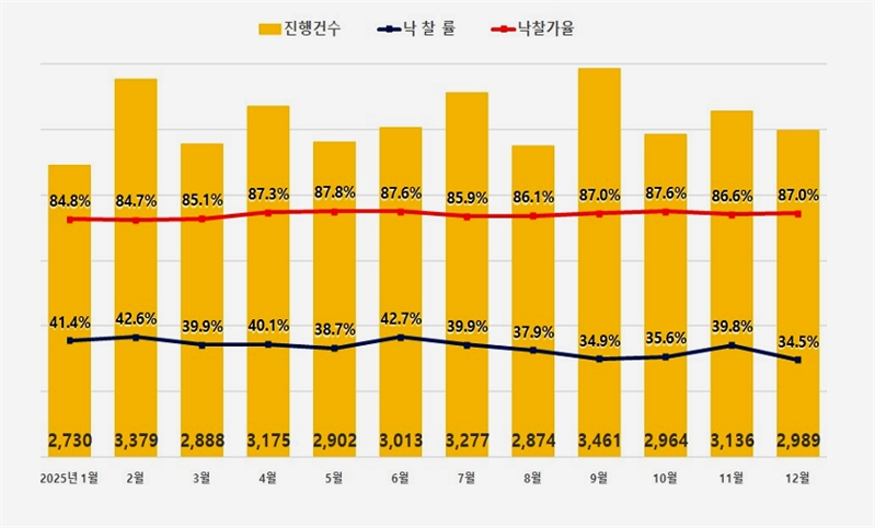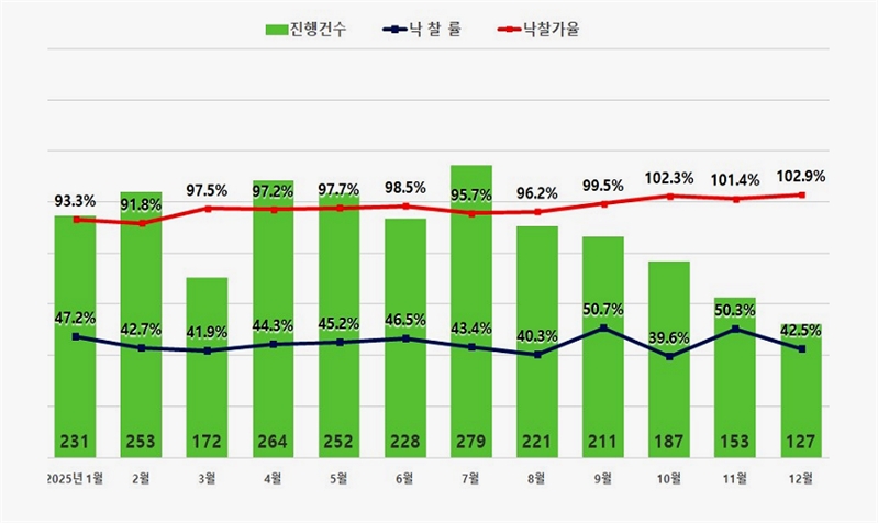 2025년 서울 아파트 진행건수 및 낙찰률, 낙찰가율 [지지옥션]